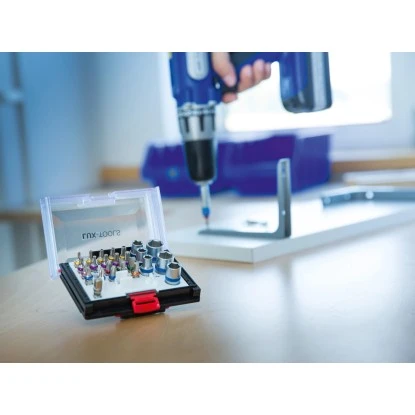 Das 28-teilige LUX-TOOLS Bit- und Steckschlüsselset ist farblich unterteilt für die einfache Auswahl der Werkzeuge und besteht aus 20 Bits aus Chrom-Vanadium-Stahl. Das Set wird in einer praktischen Kunststoffbox geliefert.