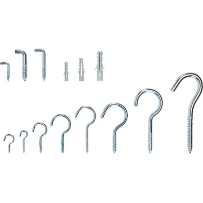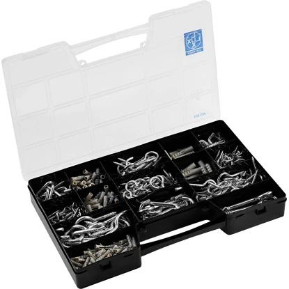 Das 400-teilige LUX-TOOLS Haken- und Dübelsortiment beinhaltet die gebräuchlichsten Haken in gebogener und gerader Ausführung sowie die dazu passenden Dübel. Im praktischen Aufbewahrungskoffer mit transparentem Deckel sind die folgenden Größen enthalten: