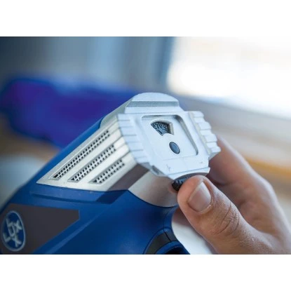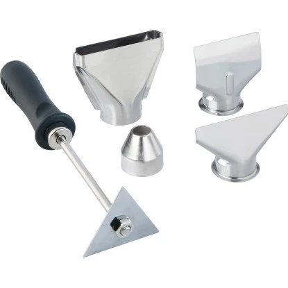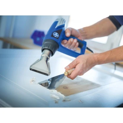 Für einen stationären Betrieb wird das Gerät einfach auf seiner geraden Rückseite aufgestellt. So haben Sie beide Hände frei, um das Bauteil in den Heißluftstrom zu halten. Der Handgriff ist mit Softgrip versehen und sehr bequem und komfortabel gepolstert. Er bietet Ihnen einen sicheren Halt ohne Abrutschen, wenn Sie das Gerät mit einer Hand führen. Praktisches Zubehör und ein großer Transportkoffer runden die Ausstattung ab.