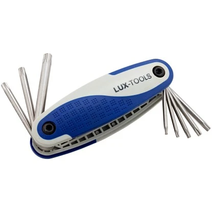 Der 8-teilige LUX-TOOLS Schlüsselhalter für TX-Schrauben ist ein hochwertiger Satz in einem schlagfesten, handlichen Kunststoffclip. Die Schlüssel haben eine mattverchromte Oberfläche für Rostschutz. Dieser Satz enthält je einen Schlüssel der Größen TX9, TX10, TX15, TX20, TX25, TX27, TX30, TX40.