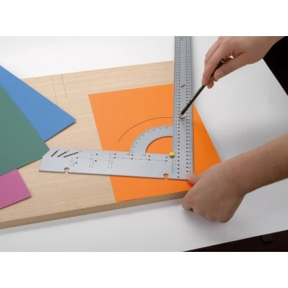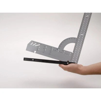 Der LUX-TOOLS Universalwinkel verfügt über eine doppelte Skalierung und Winkelmessskala sowie einen Parallelanreißer und eine Anreißschablone (für Radius sowie Kreis). Der Anschlagwinkel beträgt 90°.