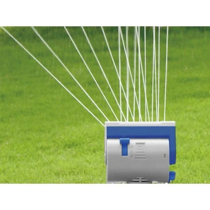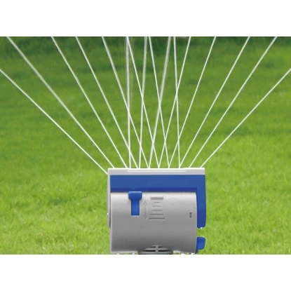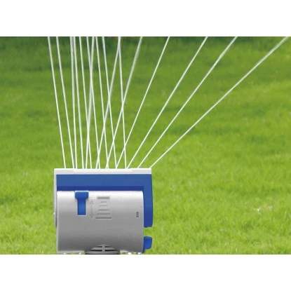 Der Viereckregner kann für eine Beregnung von kleinen bis mittelgroßen Flächen von bis zu 208 m² zum Einsatz kommen. Vielzählige Einstellungsmöglichkeiten bieten Ihnen die ideale Beregnung Ihrer Grünflächen. Der Wasserdruck und damit die Durchflussmenge lassen sich mittels Drehregler direkt am Regner bestimmen. Dadurch entfällt lästiges Hin- und Herlaufen zum Wasserhahn. Die fein abgestimmte Einstellbarkeit des Regnerkopfes erlaubt es Ihnen, viele verschiedene Beregnungspositionen zu wählen. Die 16, in zwei Reihen angeordneten Kunststoffdüsen, können zusätzlich noch links, mittig oder rechts eingestellt werden. Der große Kunststoffstandfuß garantiert einen sicheren Stand. Der Wasseranschluss des Regners ist mit allen gängigen Stecksystemen kompatibel.